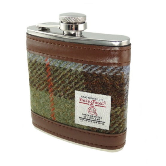 6oz Metal Hip Flask wrapped in Harris Tweed. Supplied in a Gift Box.