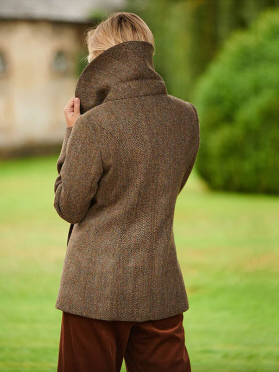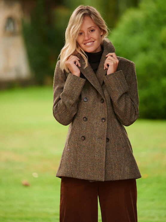 De double-breasted “Kathy” peacoat, gemaakt van 100% handgeweven, verfijnde Harris Tweed – een moderne interpretatie – biedt uitzonderlijk comfort. Ooit de warme werkkleding van havenarbeiders, is het nu een tijdloze stijlklassieker voor vrouwen. De rechte, licht getailleerde peacoat heeft een grote sjaalkraag die beschermt tegen de wind en zelfs de somberste winterdagen opfleurt. Dit veelzijdige kledingstuk krijgt zijn authentieke look door de karakteristieke double-breasted knoopsluiting met gepersonaliseerde knopen van echt hoorn en paspelzakken aan de zijkanten. Deze eigentijdse stijl, verkrijgbaar in klassieke tweedkleuren, maakt een statement en is perfect voor een verfijnde, casual look.