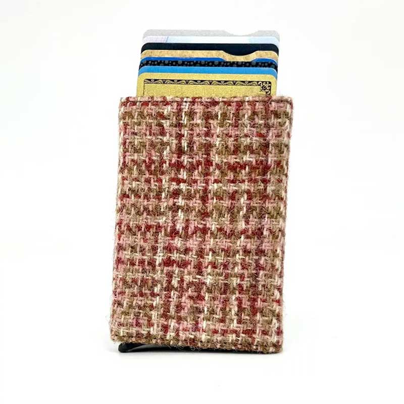 Onze cameratas is verkrijgbaar in acht Harris Tweed-kleuren. De afwerking van veganistisch leer verschilt afhankelijk van de gekozen Harris Tweed-kleur: