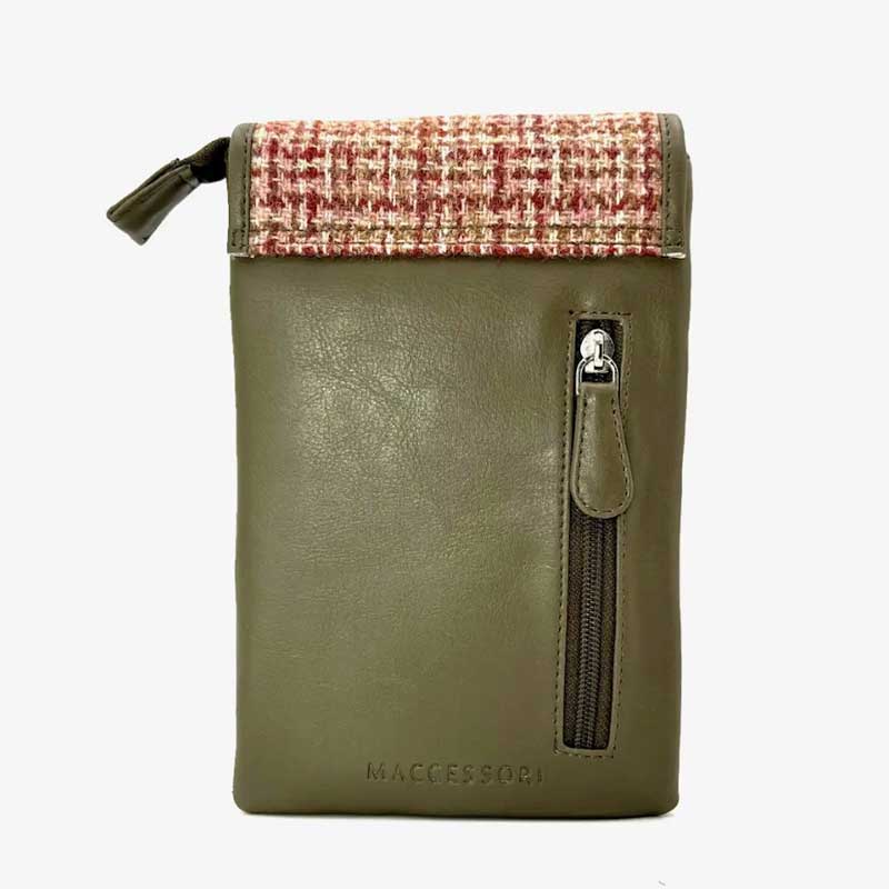 Deze Harris Tweed cameratas is ontworpen met twee interne ritsvakken voor al je essentiële spullen, een extern ritsvak en een open vak met een magnetische sluiting.