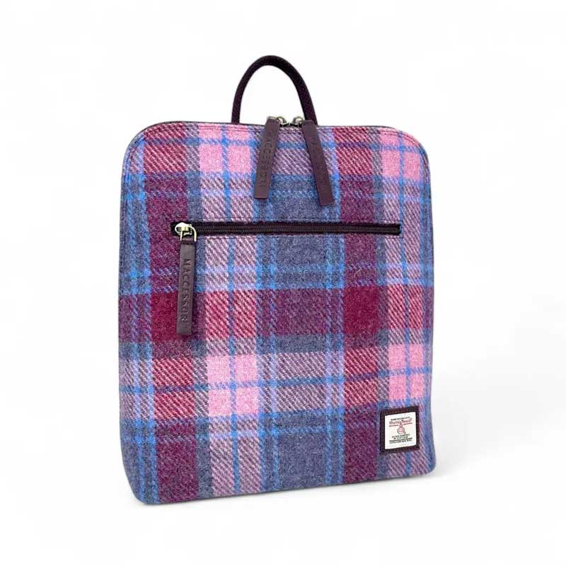 Onze cameratas is verkrijgbaar in acht Harris Tweed-kleuren. De afwerking van veganistisch leer verschilt afhankelijk van de gekozen Harris Tweed-kleur: