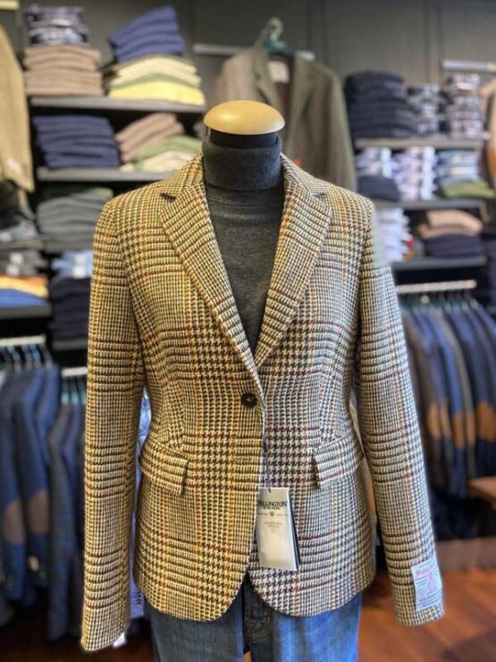 Traditie en innovatie komen samen in deze elegante Harris Tweed blazer “Ami”, een toonbeeld van superieur vakmanschap. De geselecteerde wol is handgeweven van de Buiten-Hebriden in Schotland. Het biedt een comfortabele warmte en een verfijnde look. Deze blazer met twee knopen heeft een vrouwelijk, getailleerde silhouet en een moderne snit, inclusief een inkeping in de revers, twee borstnaden, een split in de rug en een gele voering. Charmante details zijn onder andere de turquoise, met wollen fleece gevoerde onderkraag en de knopen met hoorneffect. Klassiek, tijdloos en toch modern, deze prachtige blazer kan stijlvol worden gecombineerd met vesten, rokken en casual jeans of wollen broeken.
